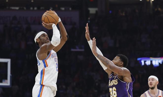 湖人五连客第三站撞上雷霆,赛前的强强对话噱头拉满,东契奇和亚历山大的对位本该是焦点。开局湖人打得顺:东契奇上篮得手,艾顿中距离命中,八村塁三分入网,7-2的开局像模像样。雷霆追4分缩到10-6后,东契奇再中三分稳住局势。可转折点来得猝不及防:湖人进攻突然卡壳,连续不中的间隙里,亚历山大连砍5分,哈腾抛投得手,亚历山大再上篮,切特两罚全中,雷霆一波11-0反超到17-10。